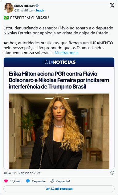 A deputada federal Erika Hilton (PSOL-SP) apresentou uma representação criminal à PGR (Procuradoria-Geral da República) nesta segunda-feira (5) contra o deputado federal Nikolas Ferreira (PL-MG) por apologia ao crime de golpe de Estado.