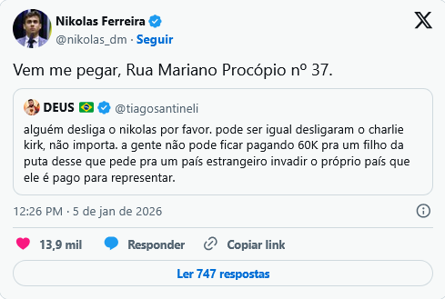A reação de Hilton não foi a primeira feita sobre as postagens de Nikolas Ferreira. No domingo (4), o humorista Thiago Santineli também se manifestou, em sua conta no “X”, contra o deputado. Santineli pediu que “desligassem” o liberal “igual desligaram o Charlie Kirk”, ativista de direita que foi assassinado em setembro de 2025.