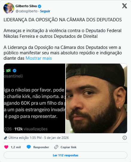 “Não estamos diante de um simples exercício de liberdade de expressão ou de crítica política, mas de um ato criminoso, covarde e explícito”, defendeu. “Ao sugerir que alguém “desligue” um parlamentar democraticamente eleito, fazendo alusão direta à eliminação física, o autor da postagem cruza a linha da legalidade e atenta contra a própria democracia”, completou.