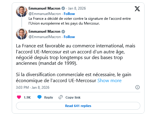 Na véspera da votação, o presidente francês, Emmanuel Macron, reafirmou a posição de que Paris votaria contra o acordo. “Embora a diversificação comercial seja necessária, os benefícios econômicos do acordo UE-Mercosul serão limitados para o crescimento francês e europeu”, escreveu em comunicado.