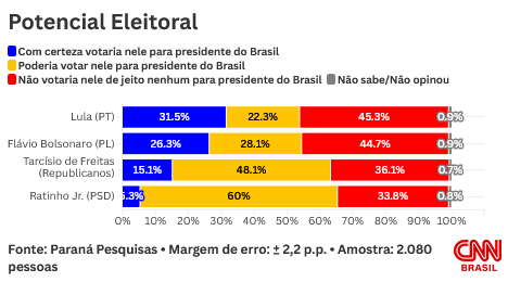 A pesquisa de hoje também avaliou os índices de rejeição dos governadores de São Paulo, Tarcísio de Freitas (Republicanos), e do Paraná, Ratinho Junior (PSD). Segundo os dados, 36,1% não votariam de jeito nenhum no líder paulista, e 33,8% no gestor paranaense (veja os detalhes no gráfico abaixo).