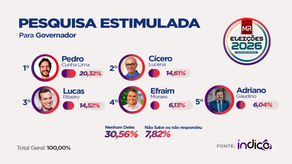 O levantamento aponta ainda o senador Efraim Filho (União Brasil) com 6,13% e o deputado estadual Adriano Galdino (Republicanos) com 6,04%. Entre os entrevistados, 30,56% afirmaram que não votariam em nenhum dos nomes apresentados, enquanto 7,82% não souberam ou preferiram não responder. O resultado indica um cenário fragmentado, com vantagem inicial de Pedro Cunha Lima em sua cidade natal, enquanto Cícero e Lucas dividem o segundo posto e refletem o peso político de João Pessoa e Campina Grande.