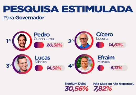 O levantamento aponta ainda o senador Efraim Filho (União Brasil) com 6,13% e o deputado estadual Adriano Galdino (Republicanos) com 6,04%. Entre os entrevistados, 30,56% afirmaram que não votariam em nenhum dos nomes apresentados, enquanto 7,82% não souberam ou preferiram não responder. O resultado indica um cenário fragmentado, com vantagem inicial de Pedro Cunha Lima em sua cidade natal, enquanto Cícero e Lucas dividem o segundo posto e refletem o peso político de João Pessoa e Campina Grande.