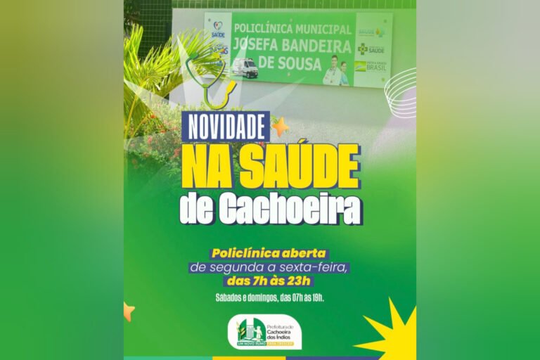 A Prefeitura informa que a Policlínica Municipal Josefa Bandeira de Sousa, que já atende a população de Cachoeira dos Índios, passa a funcionar com atendimento ampliado, garantindo ainda mais acesso aos serviços de saúde. O funcionamento ocorre de segunda a sexta-feira, das 7h às 23h, e aos sábados e domingos, das 7h às 19h.