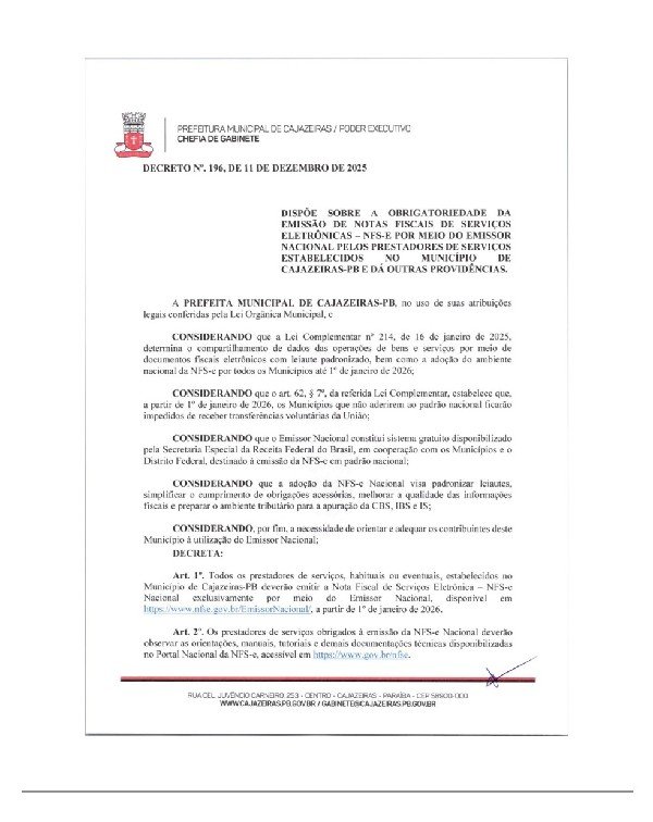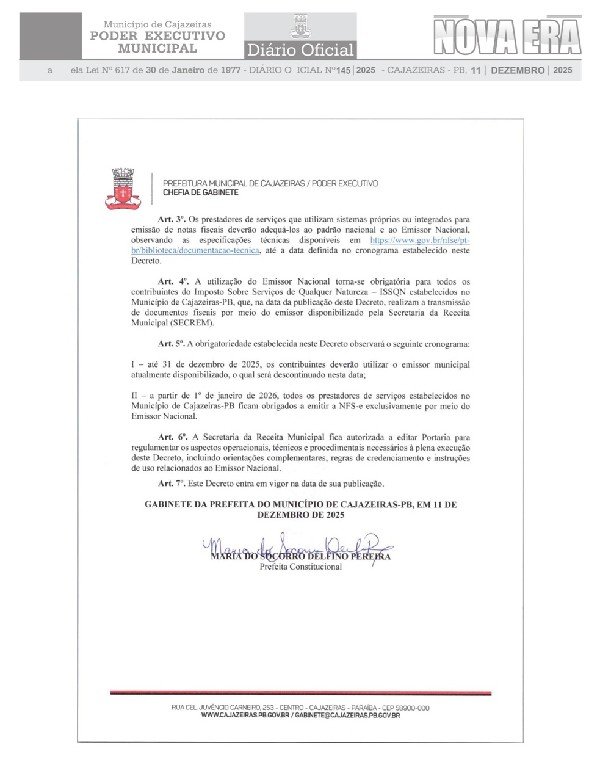 A Prefeitura de Cajazeiras, por meio da Secretaria da Receita Municipal, informa que, a partir de 1º de janeiro de 2026, entrará em vigor a adoção oficial do Sistema Nacional da Nota Fiscal de Serviços Eletrônica (NFS-e). A iniciativa integra o município à plataforma nacional desenvolvida pelo Governo Federal, que unifica e moderniza a emissão de documentos fiscais de serviços em todo o país.