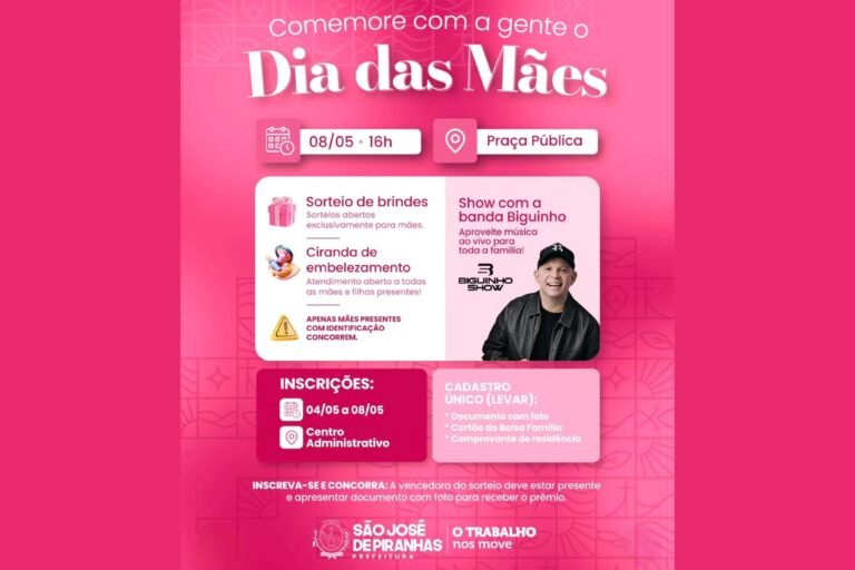 A Prefeitura de São José de Piranhas realizará, no dia 8 de maio, uma programação especial em comemoração ao Dia das Mães. O evento acontece a partir das 16h, na praça pública da cidade, com uma tarde dedicada à celebração e ao cuidado com as mães do município.