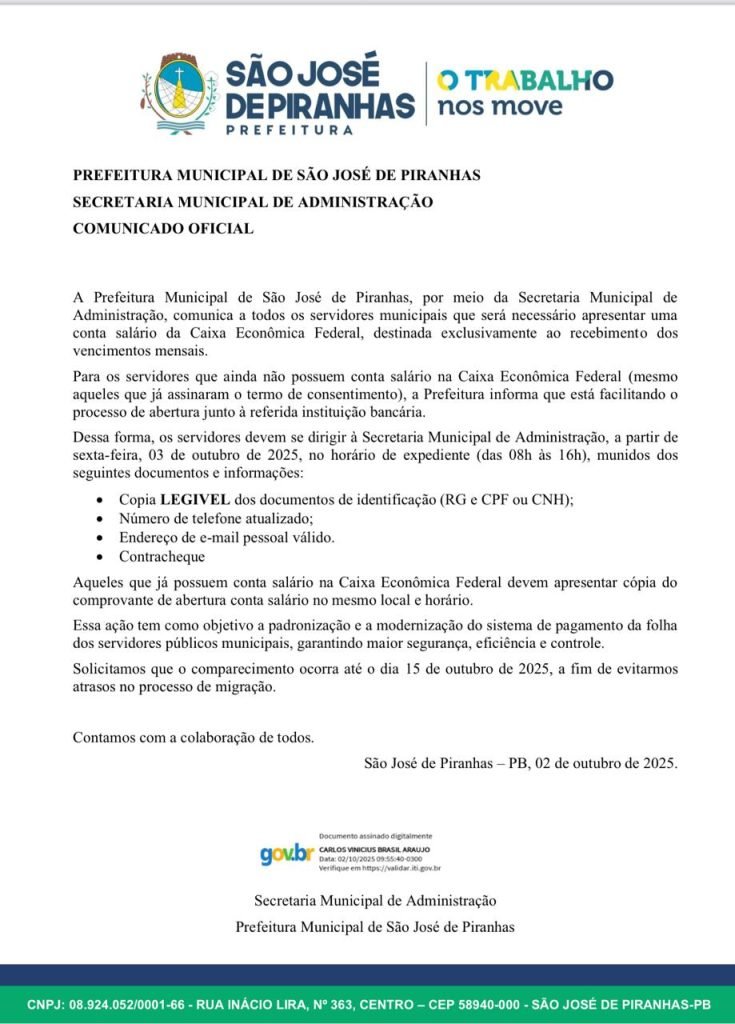 A Prefeitura de São José de Piranhas, por meio da Secretaria Municipal de Administração, anunciou uma medida importante que afeta todos os servidores do município. A gestão divulgou, nesta semana, um comunicado oficial convocando os funcionários públicos a realizarem a abertura de uma conta salário na Caixa Econômica Federal, que será utilizada exclusivamente para o recebimento dos vencimentos mensais.