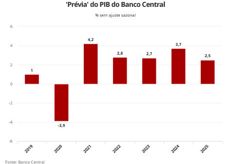 • Com o crescimento registrado no último ano, o indicador do BC mostra desaceleração da economia em relação a 2024, quando houve uma expansão maior: de 3,7%.