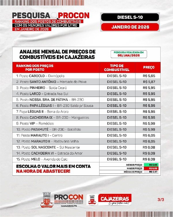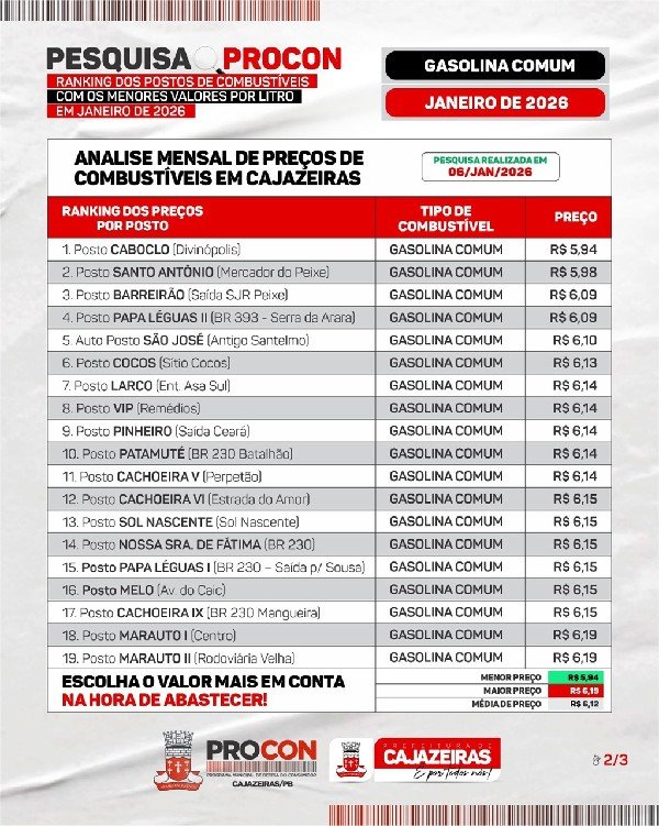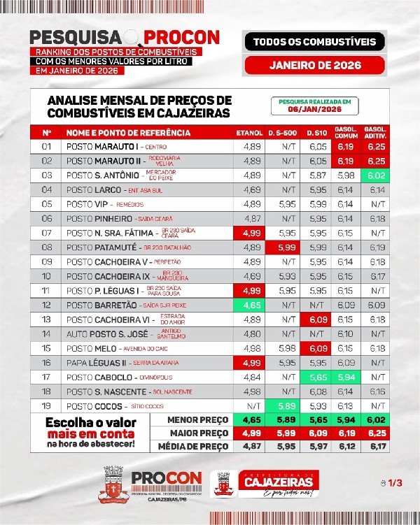 O Procon Municipal de Cajazeiras realizou pesquisa de preços dos combustíveis em janeiro de 2026 para ajudar o consumidor a economizar na hora de abastecer.