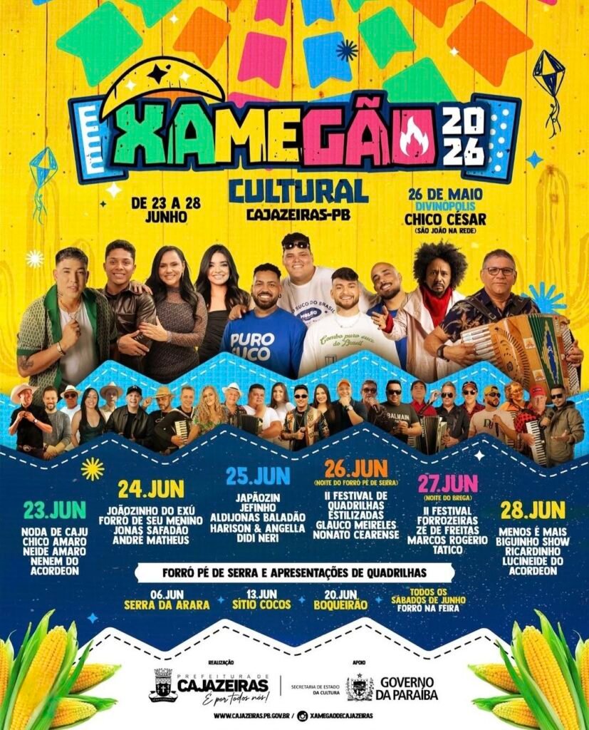 A Prefeitura de Cajazeiras anunciou a programação do Xamegão Cultural 2026, que terá início no dia 6 de junho com o “Forró nos Distritos”. As primeiras festas ocorrerão em Serra da Arara (6), Sítio Cocos (13) e Boqueirão (20), sempre aos sábados, com forró durante o dia nas feiras e, à noite, apresentações nas comunidades. Antes disso, no dia 26 de maio, o distrito de Divinópolis recebe show de Chico César.