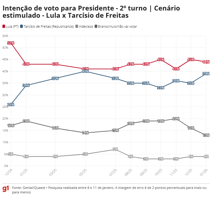 Em relação à pesquisa anterior, de dezembro, Lula oscilou de 45% para 44%. Tarcísio foi de 35% para 39%. A diferença diminuiu de dez para cinco pontos percentuais.