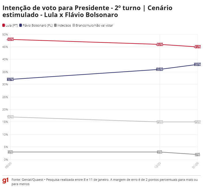 No cenário com Lula e Flávio, o presidente oscilou de 46% para 45% em relação a dezembro. O senador tinha 36% e agora tem 38%.