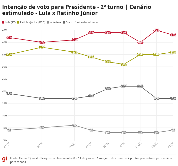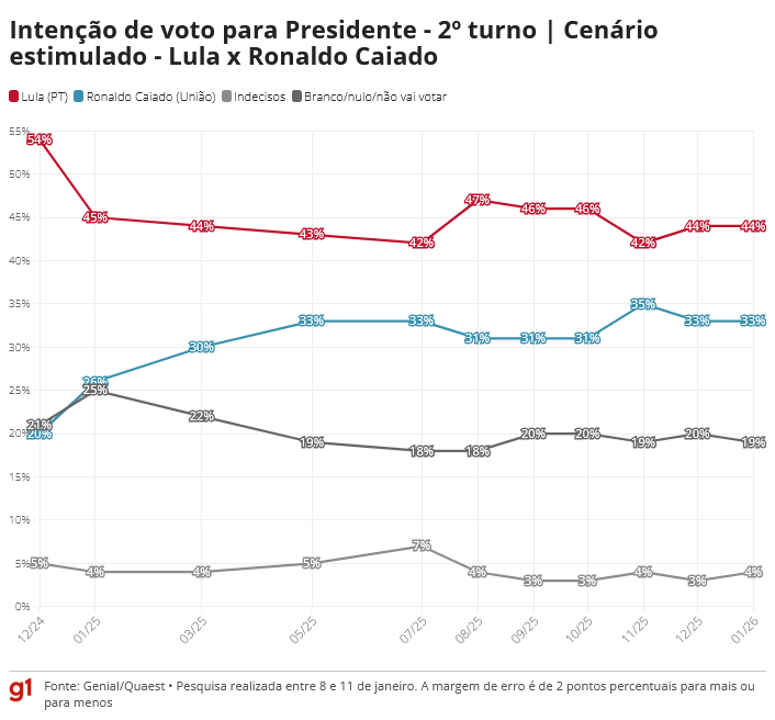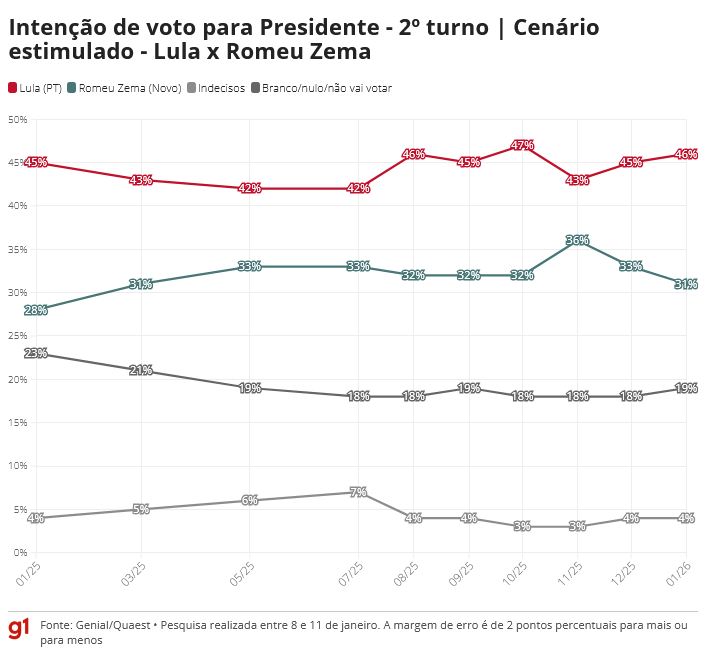 A primeira pesquisa Quaest de 2026, divulgada nesta quarta-feira (14), mostra o presidente Lula (PT) à frente em todos os cenários de 2º turno testados, com vantagens que variam entre cinco e 20 pontos percentuais.