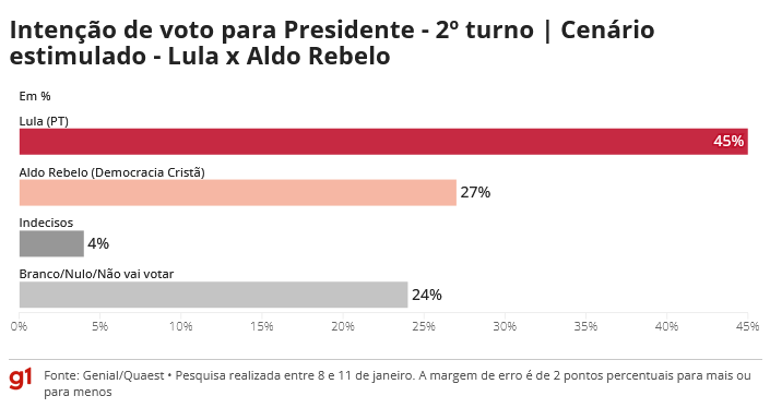 - Lula (PT): 45%;