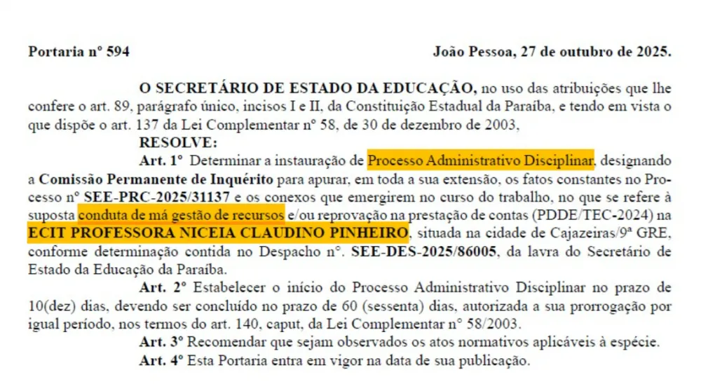 A Secretaria de Estado da Educação da Paraíba instaurou um Processo Administrativo Disciplinar (PAD) para apurar uma suposta má gestão de recursos e/ou reprovação na prestação de contas referentes ao Programa Dinheiro Direto na Escola (PDDE/TEC-2024) na Escola Cidadã Integral Técnica (ECIT) Professora Niceia Claudino Pinheiro, localizada em Cajazeiras. A determinação foi publicada por meio da Portaria nº 594, datada de 27 de outubro de 2025, assinada pelo secretário de Estado da Educação.