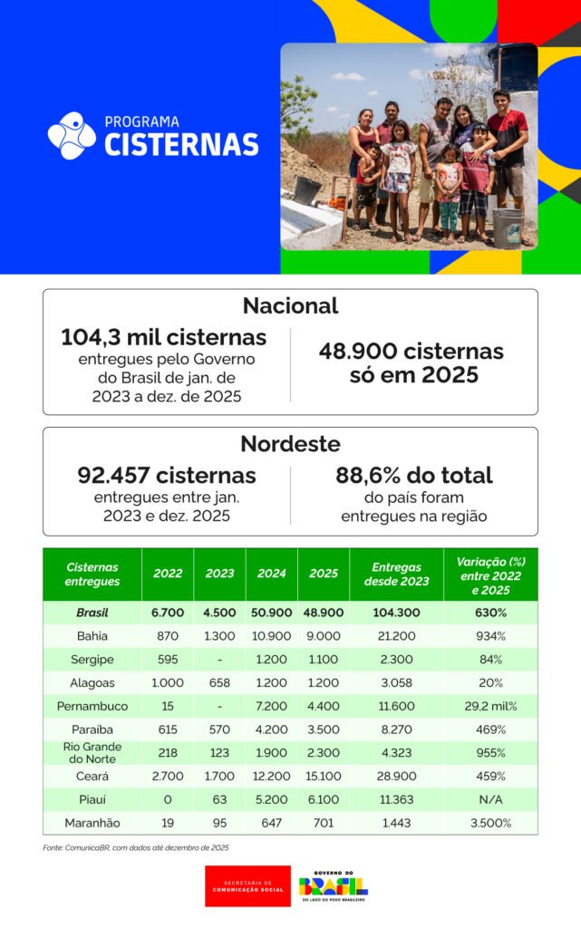 A tecnologia social incentivada pelo Governo do Brasil desde 2003 voltou a ser prioridade em 2023 e mudou cenários, criou oportunidades e significou melhoria de renda a dezenas de milhares de famílias. O programa fechou 2025 com 104.300 unidades de captação e armazenamento de água entregues desde o início deste mandato do presidente Luiz Inácio Lula da Silva. Na comparação entre 2025 (48.900) e 2022 (quando foram entregues 6,7 mil cisternas em todo o país), o crescimento é de 630%.