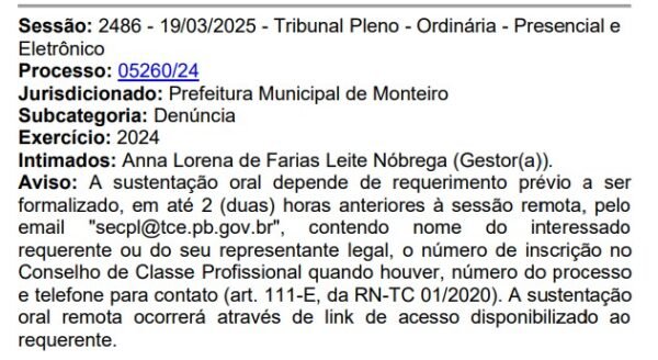 O Tribunal de Contas do Estado da Paraíba (TCE-PB) intimou a prefeita de Monteiro, Ana Paula (PSB), para explicar dispensas de licitações para serviços de coleta de lixo que, juntas, somam mais de R$ 1 milhão. Ela deve comparecer ao Tribunal no dia 19 de março.