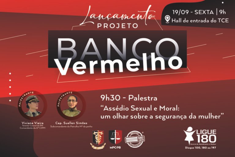 O Tribunal de Contas da Paraíba (TCE-PB) e o Ministério Público de Contas (MPC) formalizam, na sexta-feira (19), a adesão ao Projeto Banco Vermelho, iniciativa de conscientização e combate à violência contra a mulher e ao feminicídio. A solenidade será realizada a partir das 9h, no hall de entrada do TCE-PB.