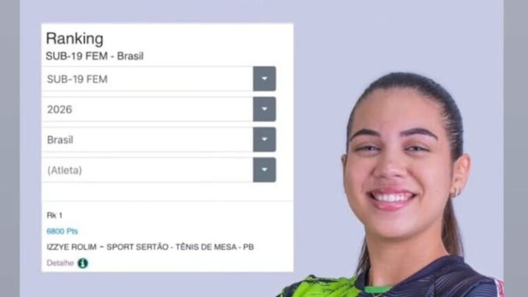A tenista de mesa cajazeirense Izzye Rolim alcançou o topo do ranking brasileiro na categoria sub-19 feminino. Com 6.800 pontos acumulados, a atleta do Sport Sertão Cajazeiras lidera a lista nacional, consolidando-se como uma das principais revelações do tênis de mesa paraibano. A conquista coloca Izzye como a principal representante da sua faixa etária no país.