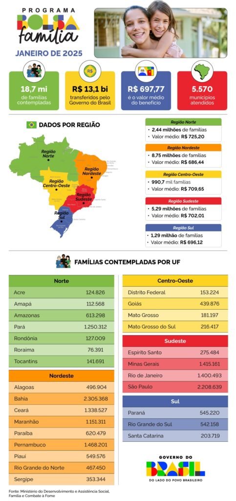 NACIONAL — Em todo o país, o Bolsa Família chega a 18,77 milhões de beneficiários a partir desta segunda-feira (19), nos 5.570 municípios do país. O valor médio é de R$ 697,77, a partir de um investimento de R$ 13,1 bilhões.