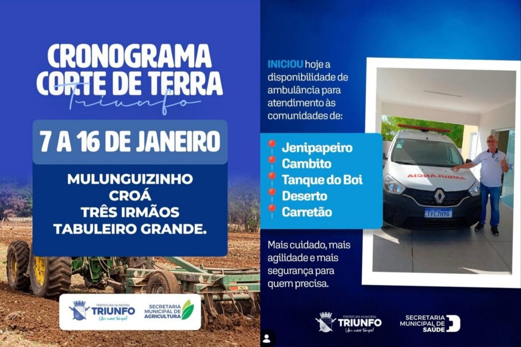 A Prefeitura informa que o cronograma de Corte de Terra teve início no dia 7 e segue até 16 de janeiro, contemplando as comunidades de Mulunguizinho, Croá, Três Irmãos e Tabuleiro Grande. Por meio da Secretaria de Agricultura, a gestão municipal segue apoiando o homem e a mulher do campo, fortalecendo a produção rural.